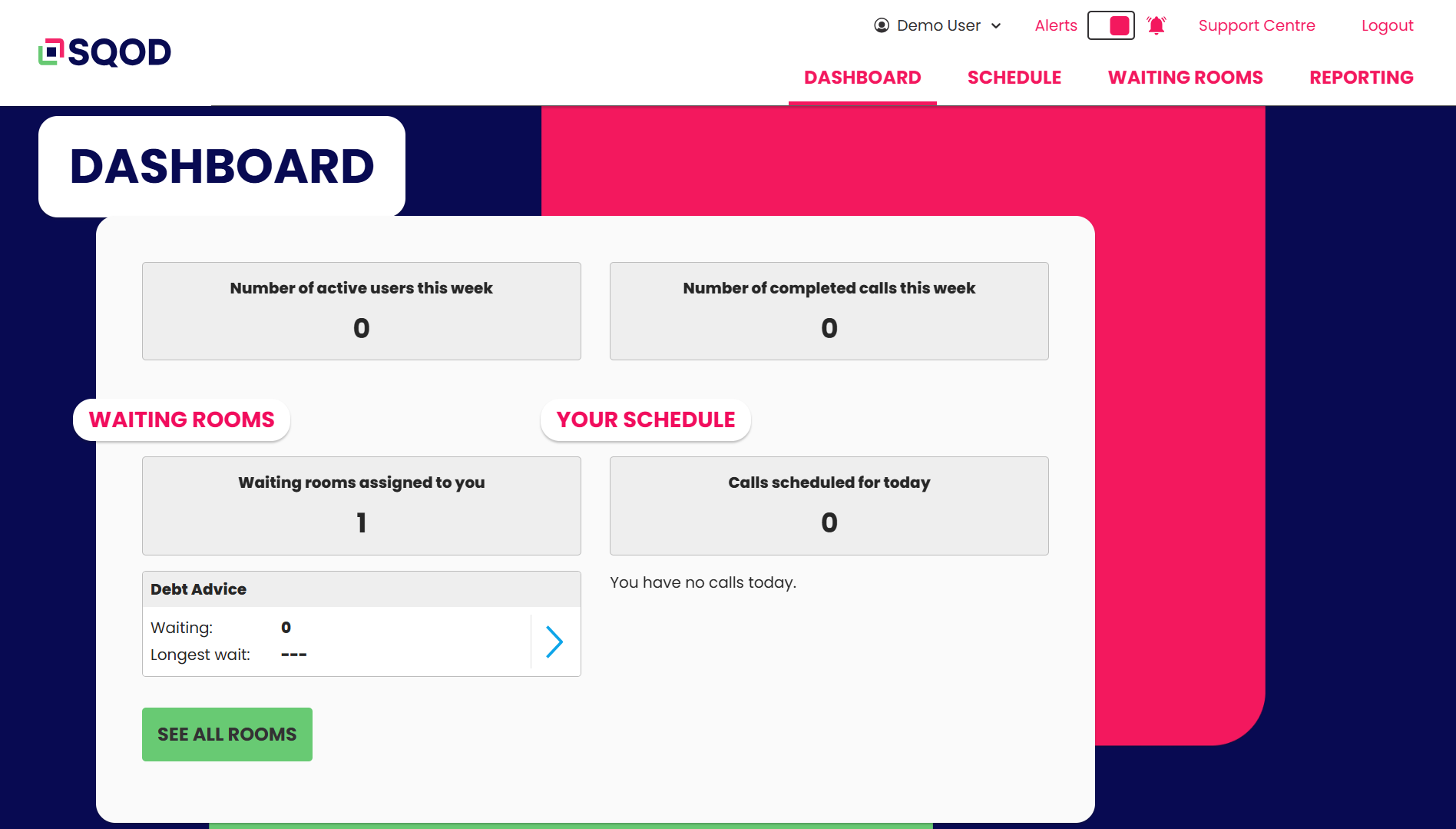 The Dashboard is the first tab presented to an Agent/Clinician or Scheduler once logged into the platform. The content within the tiles will vary dependent on role, features utilised and activity. A user has a view of the service they are assigned to - whether waiting rooms or scheduled calls - and can choose to navigate directly to that service by selecting the right hand directional arrow. If a Service user is waiting to be seen this will be indicated in the waiting room tile, including how long they have been waiting.