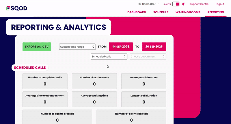 You have the ability to customise a date range and view/filter the type of consultations your organisations makes whether that be Scheduling Calls or utilising Waiting Rooms. If you are an Administrator or an Agent within a handful of waiting rooms, across departments, you can view these at selective levels and by a custom date range.