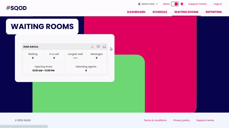You can view Waiting rooms assigned to you from the Dashboard screen. A Department Administrator can view all Waiting rooms within a department, and a Customer Administrator across the organisation.